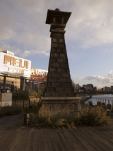 中州の川沿いの屋台が忙しく準備している横を抜けキャナルシティ方面に歩いていくと、どーんとそびえ立つ時代を感じさせるモニュメントが。