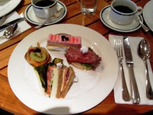 リドガーデンで、ハンバーガーを食べるIさんと、既に完食の娘、視線の先には5名の男性グループが(^^